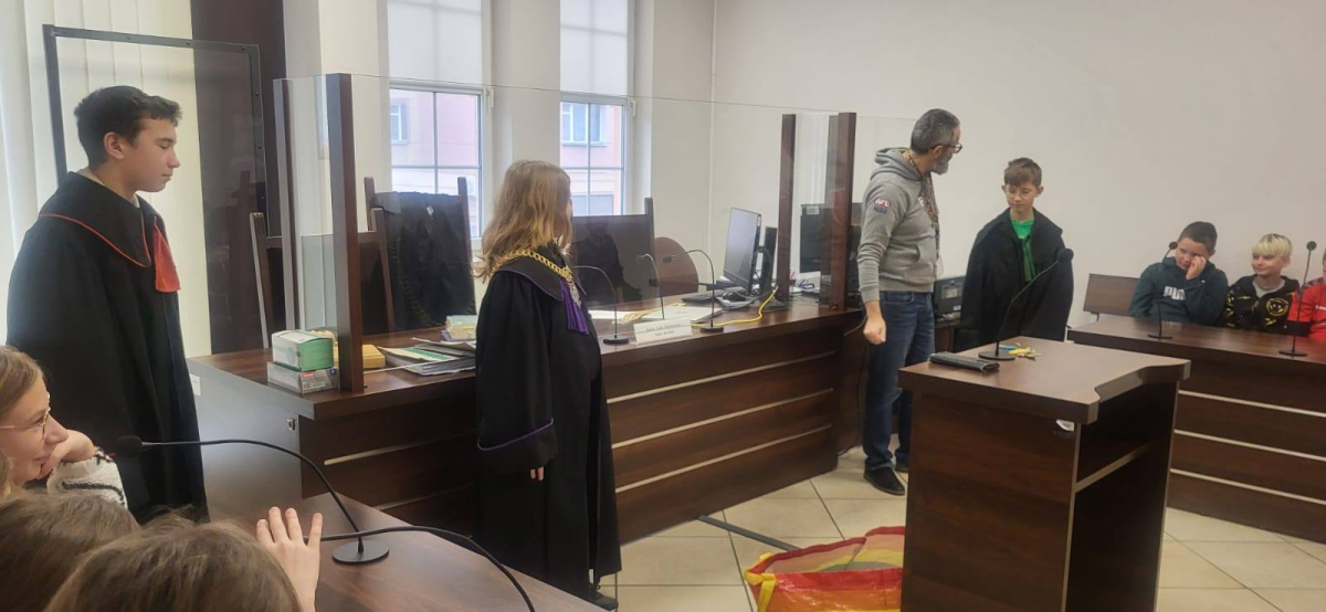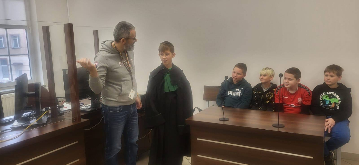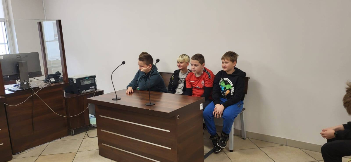 Dzieci zwiedziły salę rozpraw dla dorosłych oraz salę przeznaczoną dla nieletnich, dzięki czemu mogły zobaczyć, jak wyglądają różne elementy funkcjonowania wymiaru sprawiedliwości.